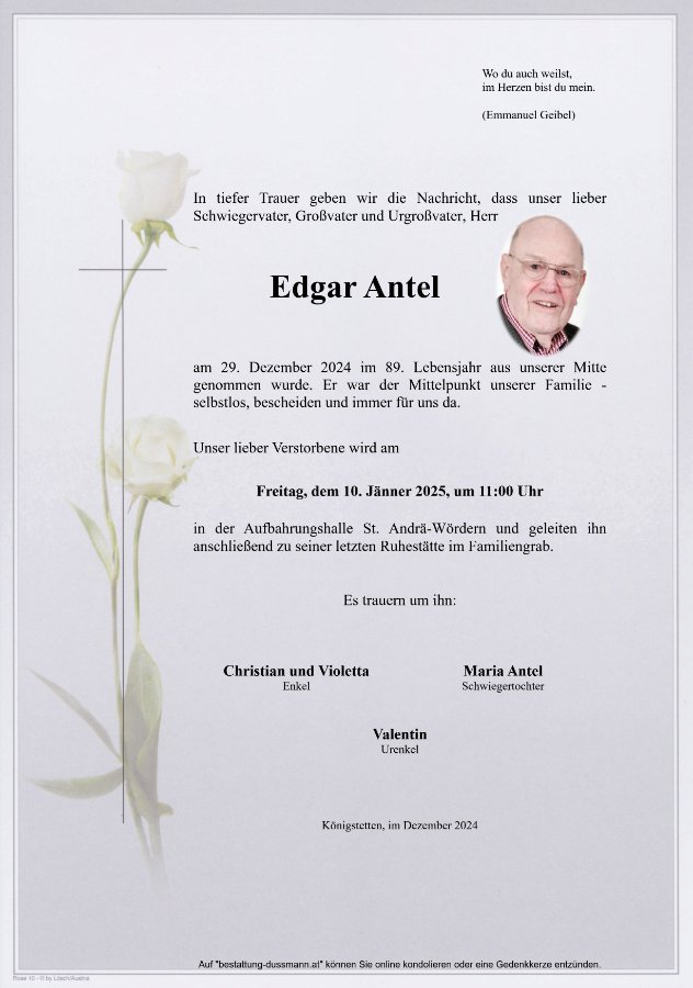 Die Erinnerung ist ein Fenster durch das wir dich sehen können wann immer wir wollen. Ein letzter Gruß und Aufrichtige Anteilnahme Leopold Hermine