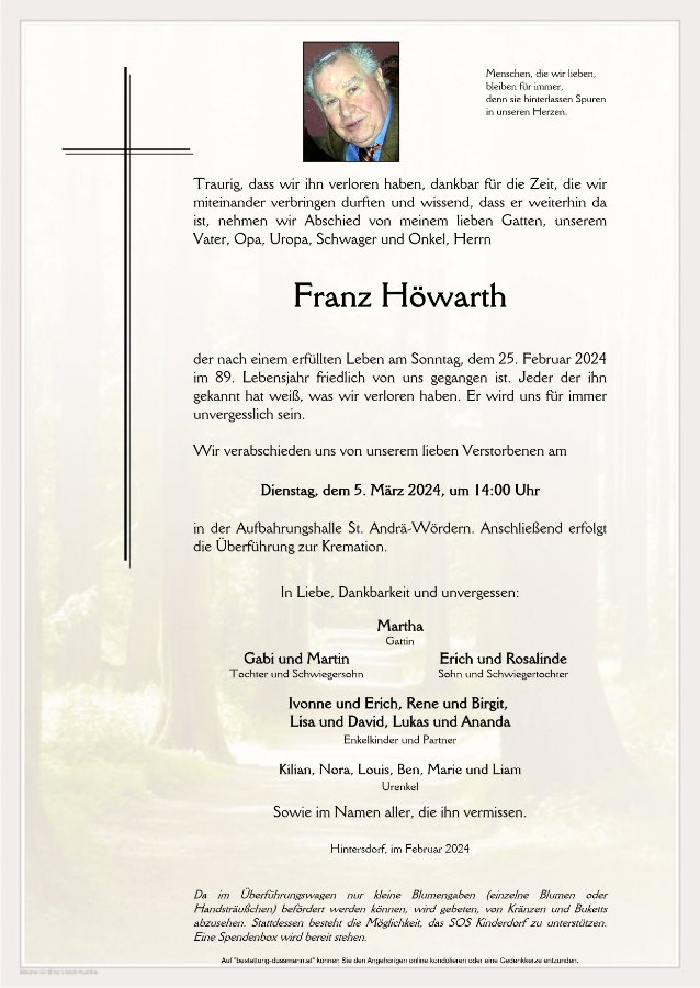 Warum?Keine kann es sagen, nur der Schmerz ,der ist geblieben und all die Fragen, die schwer auf uns drücken.Lieber Onkel Franz wir werden dich immer vermissen.Ruhe in Frieden. Du wirst immer in unseren Herzen sein.