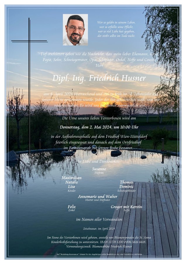 Die Tage vergehen wie im Flug aber auch die Zeit macht das Unglaubliche nicht fassbarer! Euer geliebter Fritz ist nicht nicht mehr - unfassbar und doch real. In dieser schweren Zeit können Worte nicht trösten und trotzdem wollen wir Euch viel Kraft und Zuversicht wünschen und versichern, dass wir für Euch da sind.