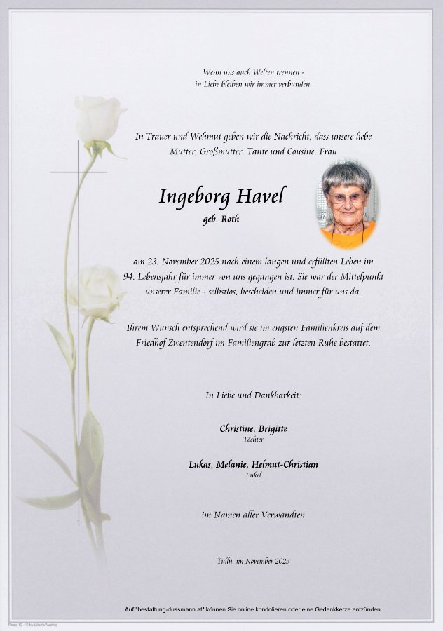 Liebe Christl, liebe Brigitte! Danke euch für diese traurige Nachricht. Es ist sehr schwer, eine geliebte Mutter zu verlieren! Ich wünsche euch viel Kraft in dieser Zeit des Abschieds. Mein herzliches Beileid! Eure Cousine Renate