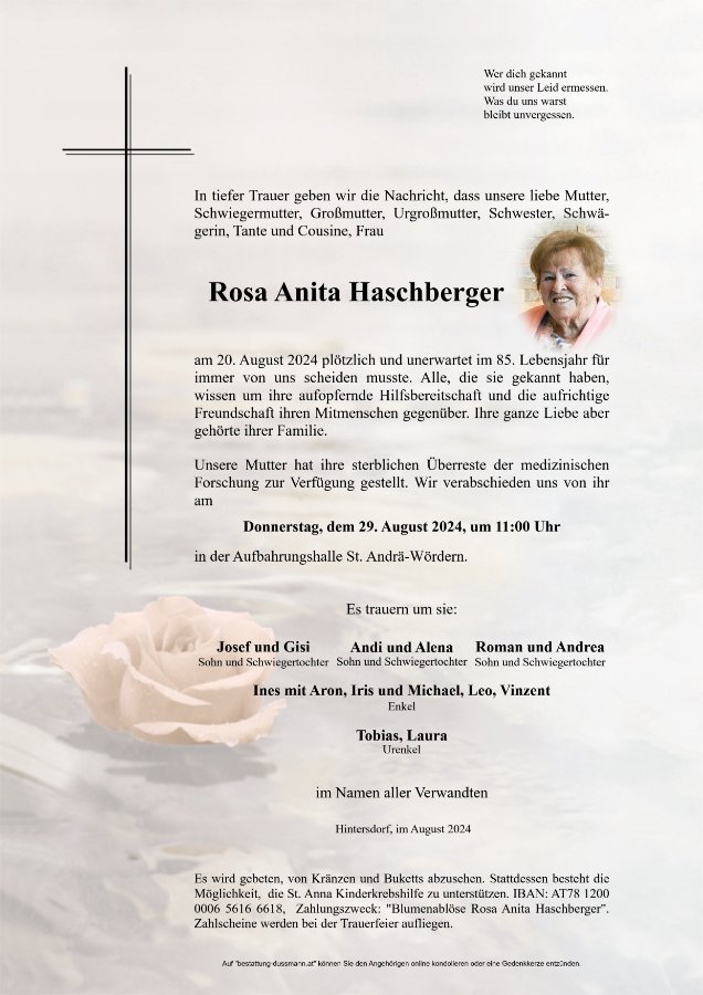 zum schmerzlichen Verlust euerer lieben Mutter und Oma möchten wir euch unser aufrichtiges Mitgefühl aussprechen. Wir haben Anita sehr gemocht und geschätzt. Ihre ganz besonders herzliche Art werden wir immer in liebevoller Erinnerung behalten. Gerade heute, an ihrem 85. Geburtstag, bin ich in Gedanken stets bei ihr.