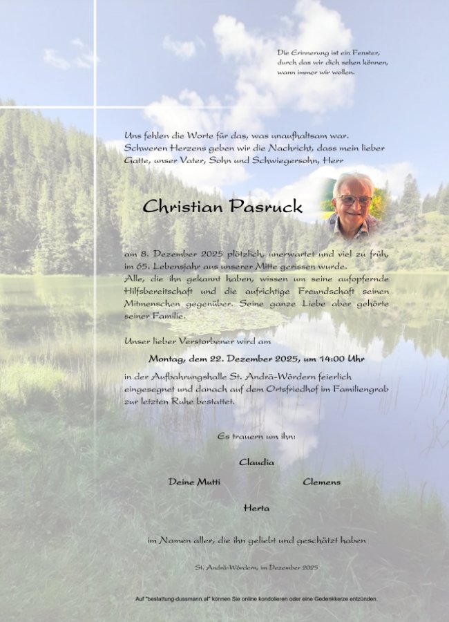 Liebe Claudia, Mein herzliches Beileid. Ich wünsche dir und deiner Familie viel Kraft und Zuversicht in dieser schweren Zeit. Gerda